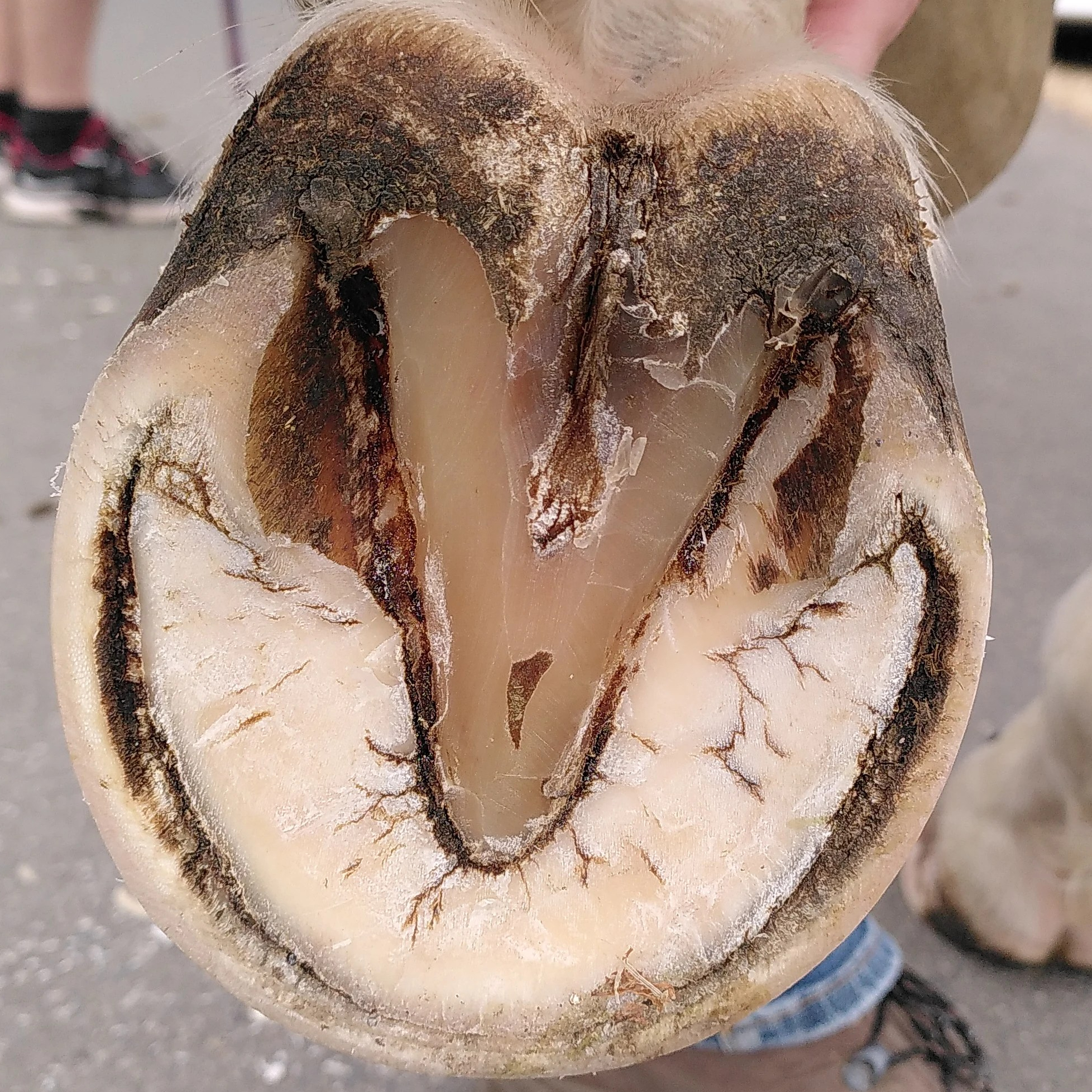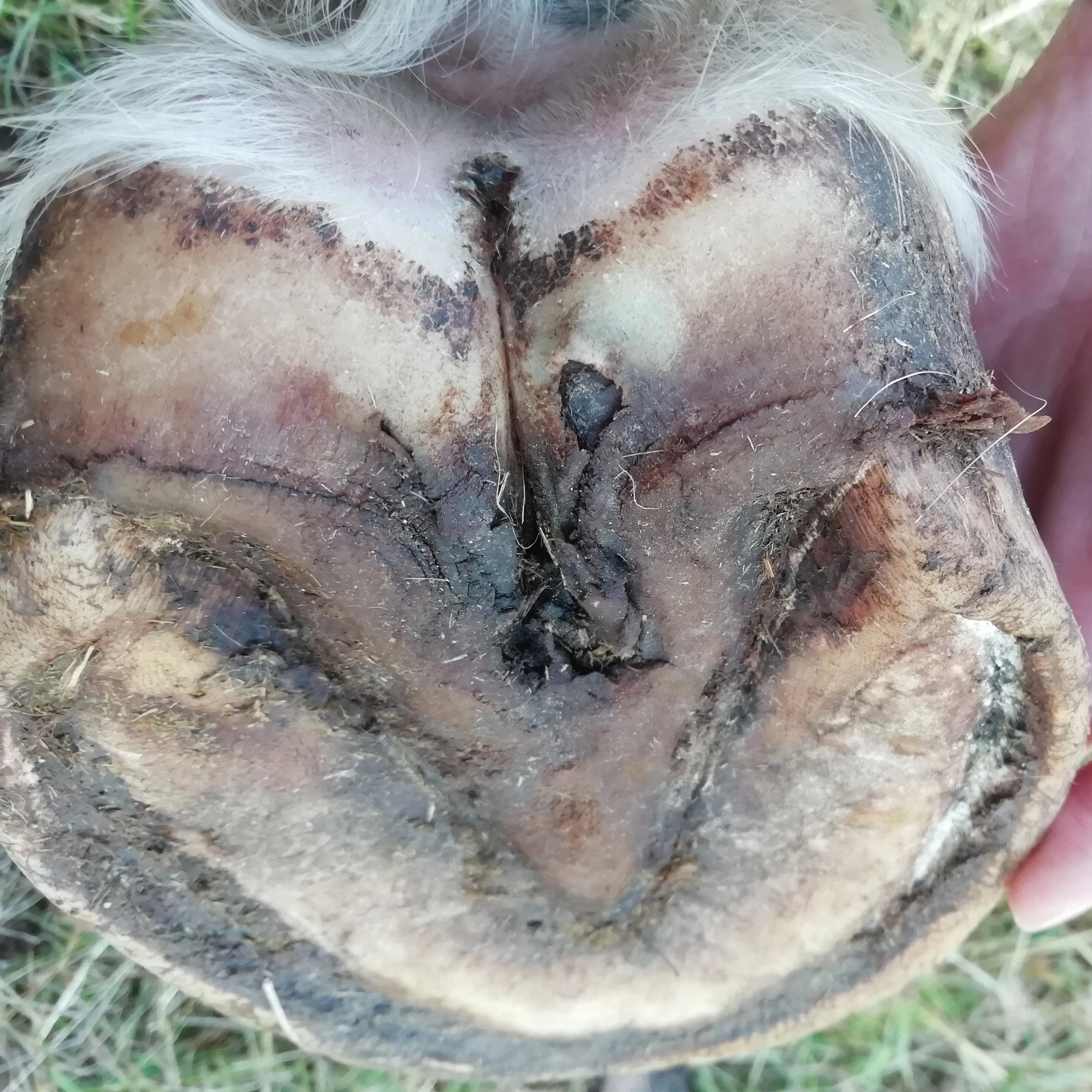 Strahlfäule bezeichnet einen Zersetzungsprozess des weichen Strahlhorns. Du erkennst sie gut an einer vertieften mittleren oder seitlichen Strahlfurche. Meist sammelt sich dort eine dunkle, übel riechende Schmiere. Auch Risse und Taschen im Strahl können anfangen zu faulen. Je weiter die Strahlfäule voranschreitet, desto mehr Strahlhorn geht verloren. Im fortgeschrittenen Stadium kann sich die Lederhaut entzünden und so das Hornwachstum negativ beeinflusst werden – dann entstehen Ringe in der Hornkapsel, ähnlich wie bei einer Hufrehe. Auch Lahmheiten können durch Strahlfäule ausgelöst werden.